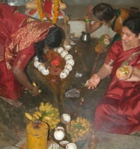 In this temple, unlike the other peethas, there is no idol for worship but a sculpted yoni. ‘Yoni’ means the source of origin that is the vulva of the Goddess and it is always moist due to a natural spring originating from the sculpture. During the festival of Ambubachi, the Goddess is said to be menstruating and the water of the spring turns red. The myth also says that the water of the Brahmaputra River flowing behind the temple also turns red with the menses of the Goddess. Unlike in the rest of Indian culture, the menses of Goddess Kamakhya is considered auspicious. Goddess Kamakhya or Shakti is considered as the embodiment of Mother Earth and when she menstruates the Earth cleanses of all impurities. Thus during this period, the sanctum is locked for three days and devotees abstain from cooking, reading holy books or plowing the field. These days are meant for her to rest where no one is supposed to demand but only serve her. On the fourth day, the doors are opened ceremoniously and a Mela is held in the premise. Thousands of devotees throng to the Goddess at her prime and receive the prasad.