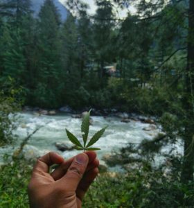 A cannabis leaf with Parvati River in the backdrop.