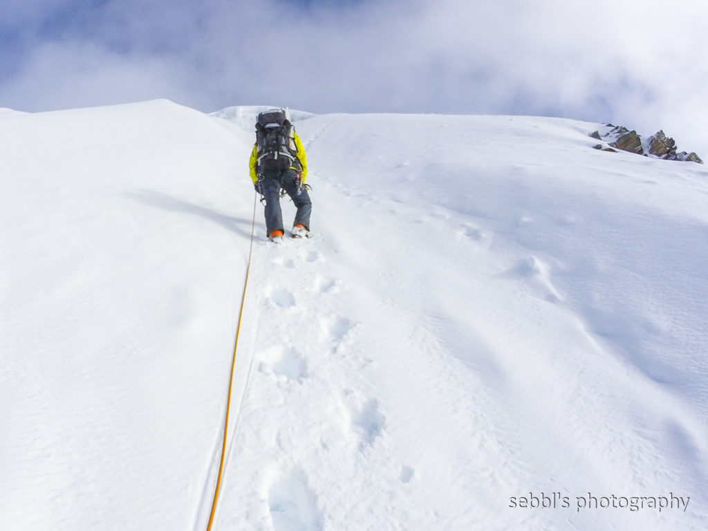 Getting to crampon point was more difficult than on Island Peak. The hike was shorter, but low visibility gave us a hard time finding the way. From there, we continued until we reached our next big objective. A 400 metres high face leading all the way to the summit. Being one of the first teams to climb Lobouche East Peak in autumn 2016, no ropes had been fixed yet. We analysed the final stretch and decided to keep to the right side due to the risk of avalanches. Pema took the lead and I followed him wheezing through the thin air. It was tough but more enjoyable than the climb on Island Peak. When we arrived at the summit, I felt extremely exhausted. All distant peaks were lulled in clouds; Everest and Lhotse remained hidden. However, experiencing the Nepalese Himalayas in perspective was totally worth the journey despite all the pain and suffering.