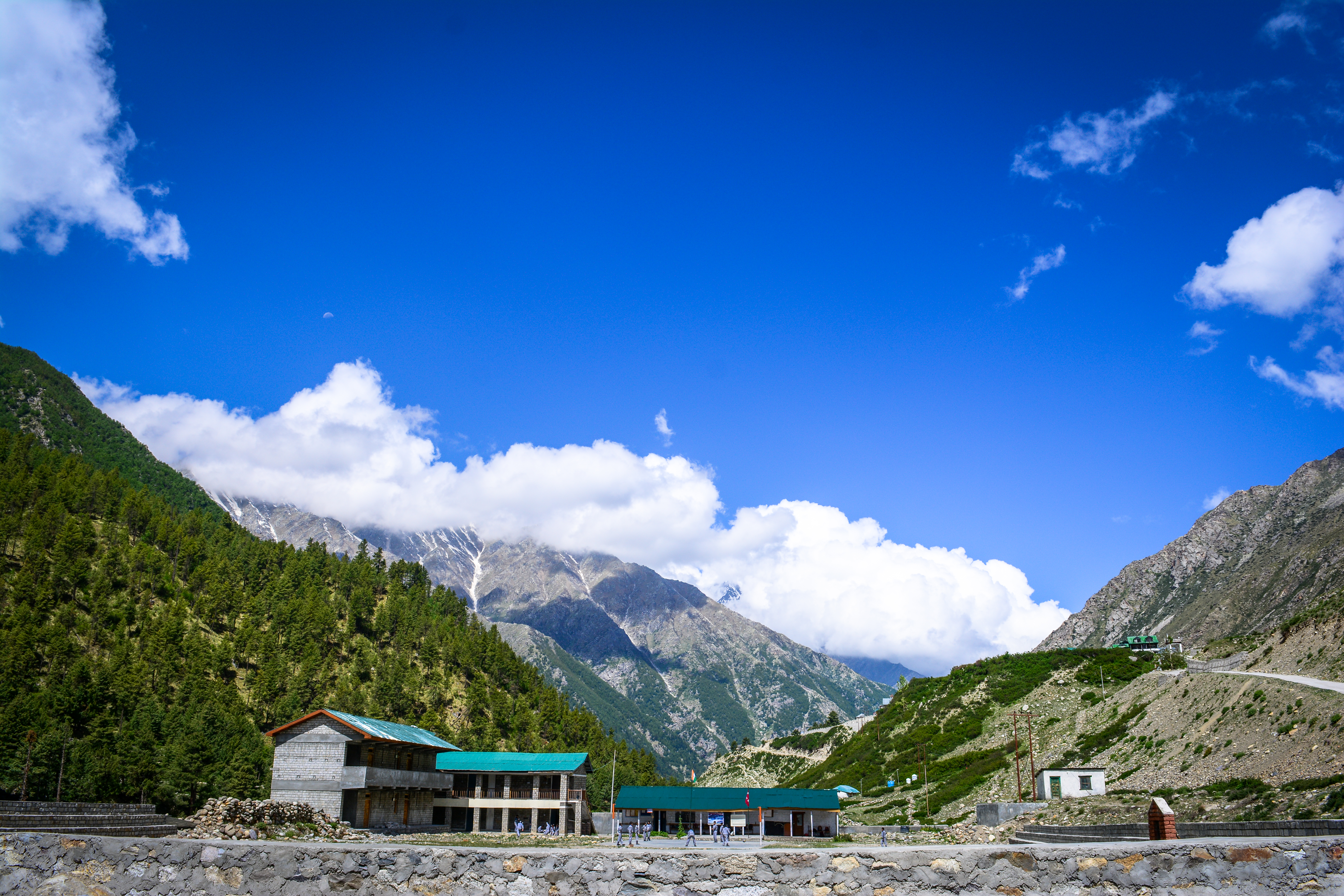 This image was clicked at a place named the “Chitkul Lake”. Chitkul Lake is situated at the heart of  Kinnaur Valley. The Chitkul lake can be reached very easily once you have reached the village named “Kalpa”. It is at a very short distance and takes around 2 hours of traveling. After that, my drive left me at a distance as the vehicle was not able go ahead so from there I walked to Chitkul Lake and I reached there within 10-15 minutes. The two houses that can be seen in the image is actually a school and the small one is the sports club of that school. So I was walking and I saw this amazing view; it felt like a chasm at a glance, and before I knew it the image was clicked in my head. So, I took my camera out of the bag and i held it in my hand and i clicked the image. It was a mesmerizing view from standing over there. The mountains and the blue sky was so awesome and the white clouds, it was very very beautiful.